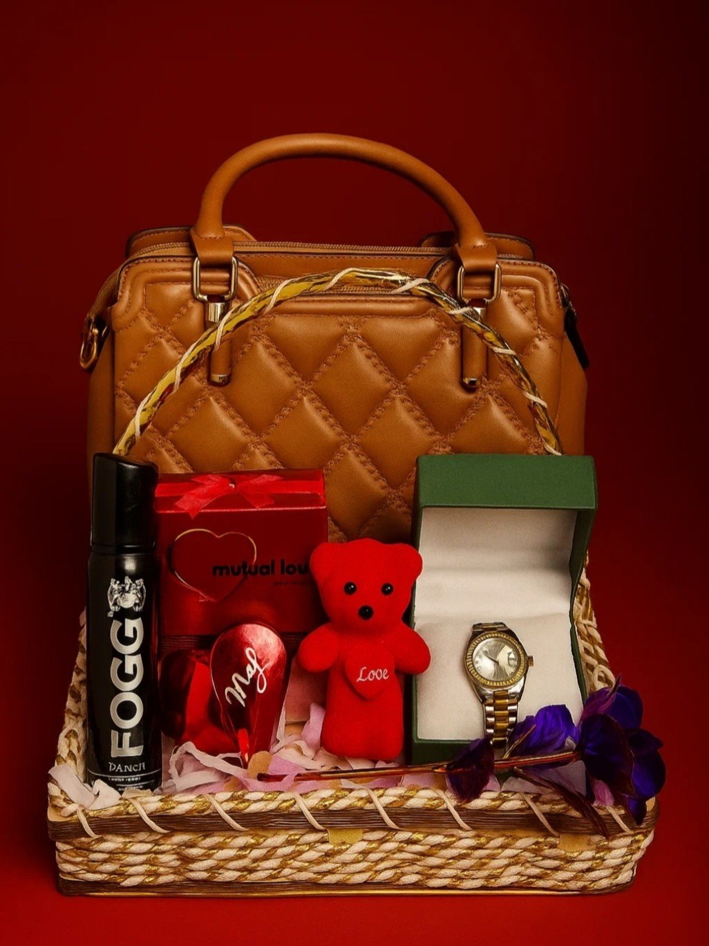 The Golden Glam Love Basket is a graceful blend of style, fragrance, and charm — an ideal gift to show love and appreciation. Inside, you’ll find a fashionable handbag for everyday elegance, a captivating perfume for lasting allure, a refreshing body spray for a burst of freshness, a beautifully crafted watch to mark timeless moments, and an adorable teddy bear that adds a soft, heartfelt touch. Perfect for birthdays, anniversaries, or special surprises, this basket brings together luxury and affection in one stunning package.